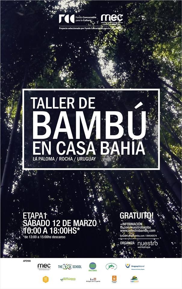 Este sábado, 12 de marzo, desde las 10 y hasta las 18 se desarrollará la primera etapa del TALLER DE BAMBÚ en Casa Bahía, La Paloma - Rocha. Se trata de una actividad gratuita dirigida a personas que tienen el bambú en su entorno inmediato o pueden acceder a él.