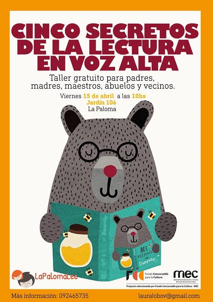 Realizarán un taller destinado a padres, madres, abuelos y vecinos donde brindarán claves y técnicas para mejorar la interpretación de textos durante la lectura en voz alta. Se dictará el próximo viernes 15 de abril a las 10 de la mañana en el Jardín 106. La actividad es gratuita y se enmarca dentro de los Fondos Concursables del MEC. Para informes: 092 465 735 o [email protected]