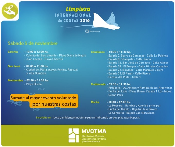 La organización que lidera esta actividad a nivel mundial es Ocean Conservancy, en Uruguay desde el 2009 el Ministerio de Vivienda, Ordenamiento Territorial y Medio Ambiente es el coordinador nacional para el Día Internacional de la Limpieza de Costas contando con el apoyo de las 6 intendencias costeras, municipios y organizaciones de la sociedad civil.