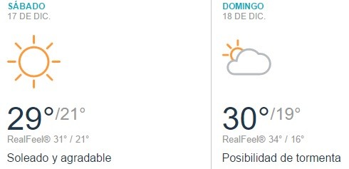 El sábado estará soleado y agradable, con una noche clara. La mínima será de 21° y la máxima de 29°. La térmica llegará a los 31°. El viento será de 18 km/ con ráfagas de 32 km/h de dirección noreste rotando hacia el nornoreste.