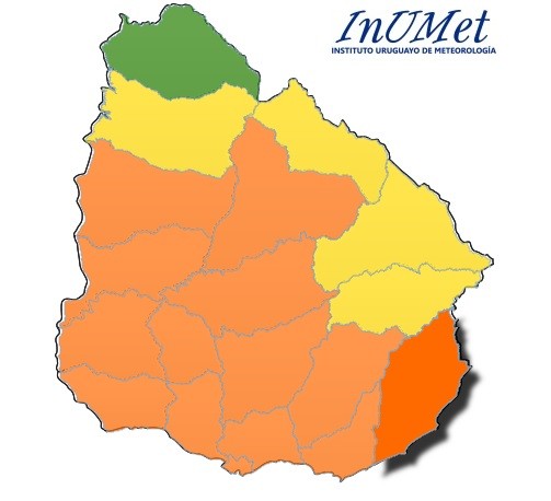 El Instituto uruguayo de Meteorología emtiió una alerta de nivel naranja a las 12:30 con vigencia gasta las 18 horas de hoy martes. La misma es para los departamentos de Montevideo, Colonia, Río Negro, Soriano, Flores, San José, Florida, Paysandú, Durazno, Canelones, Maldonado, Rocha, Tacuarembó y Lavalleja. Inumet informa que la advertencia es por "masa de aire cálida, húmeda e inestable que afecta al país generando tormentas, algunas puntualmente intensas, acompañadas de actividad eléctrica, ocasionales granizadas, precipitaciones puntualmente abundantes (50 - 80 mm en cortos períodos de tiempo) y rachas de viento fuertes (75 - 120 km/h), ocasionalmente superiores.