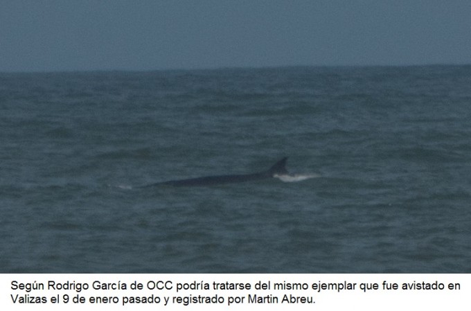Fueron vistas a 500 metros de la costa por varios turistas y especialistas. Rodrigo García, director de OCC, confirmó que se trató de un grupo de tres ballenas del tipo rorcual, ejemplares de una especie que en los 20 años de trabajo de la ong nunca habían sido avistados tan cerca de la costa.