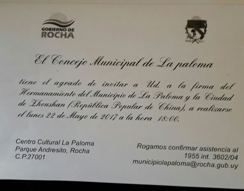 Según lo manifestado por distintas autoridades y representantes de instituciones que habían sido invitados a la firma del hermanamiento con representantes de la Ciudad China de Zhonshuan a realizarse hoy en el Centro Cultural La Paloma, el horario fue modificado a último momento y los invitados están recibiendo la comunicación telefónica que el acto se llevará a cabo hoy a las 16, es decir dentro de una hora y no a las 18 como estaba pautado.