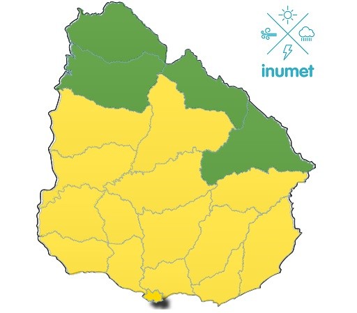 Luego de varias horas de alerta naranja, Inumet actualizó el pronóstico y mantiene alerta pero esta vez de color amarillo a raíz de una "perturbación atmosférica que favorece el desarrollo de tormentas, algunas puntualmente intensas acompañadas de los siguientes fenómenos:
