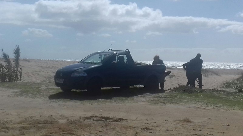Esta mañana, alrededor de las 8, una vecina de Arachania bajó a la playa y encontró una camioneta azul y tres personas que cargaban arena en la misma, sacándola de uno de los médanos ubicados  en la bajada principal.