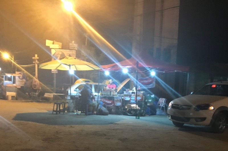 Un gazebo y un sombrillón cubren un gran puesto callejero que vende alcohol, hamburguesas y chorizos -esto último por cuestiones higiene está prohibido vender de forma ambulante- en plena calle. Iluminan el punto con una luz conectada a la batería de un volskwagen gol con matrícula de Maldonado. Nadie aparece. Nadie interviene…