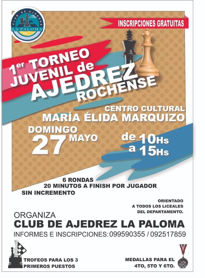 Se realizará en el Centro Cultural María Élida Marquizo el domingo 27 de mayo de 10 a 15 horas. El evento, organizado por el Club de Ajedrez de La Paloma, está orientado a todos los liceales del Departamento de Rocha. Habrá trofeos para los tres primeros puestos y medallas para el 4to., 5to., y 6to. Informes e inscripciones al 099 590 355 o al 092 517 859.