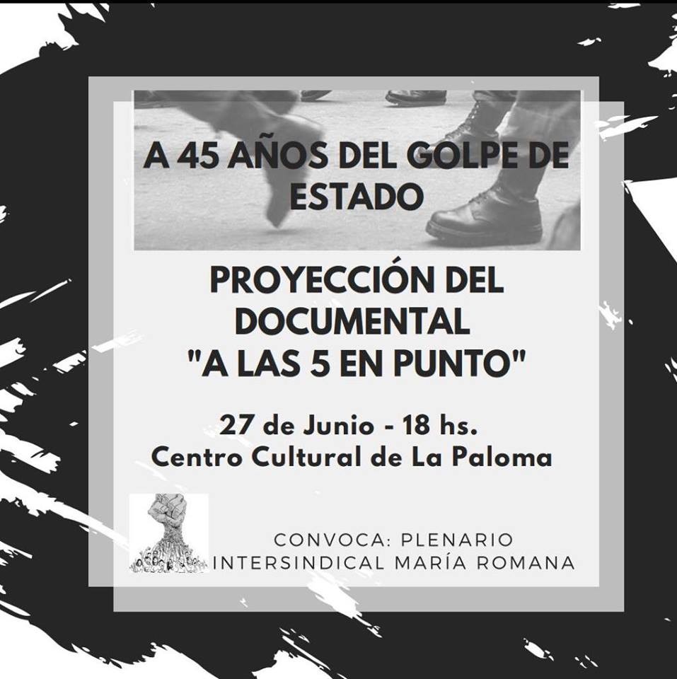 Este miércoles 27 a las 18 horas en el Centro Cultural La Paloma se proyectará el documental "A las 5 en punto". Convoca Plenario Inersindical María Romana.