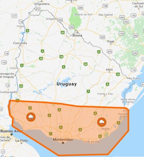 El instituto Uruguayo de Meteorología actualizó una advertencia de nivel naranja para varias zonas del país, y gran parte de Rocha está incluída.