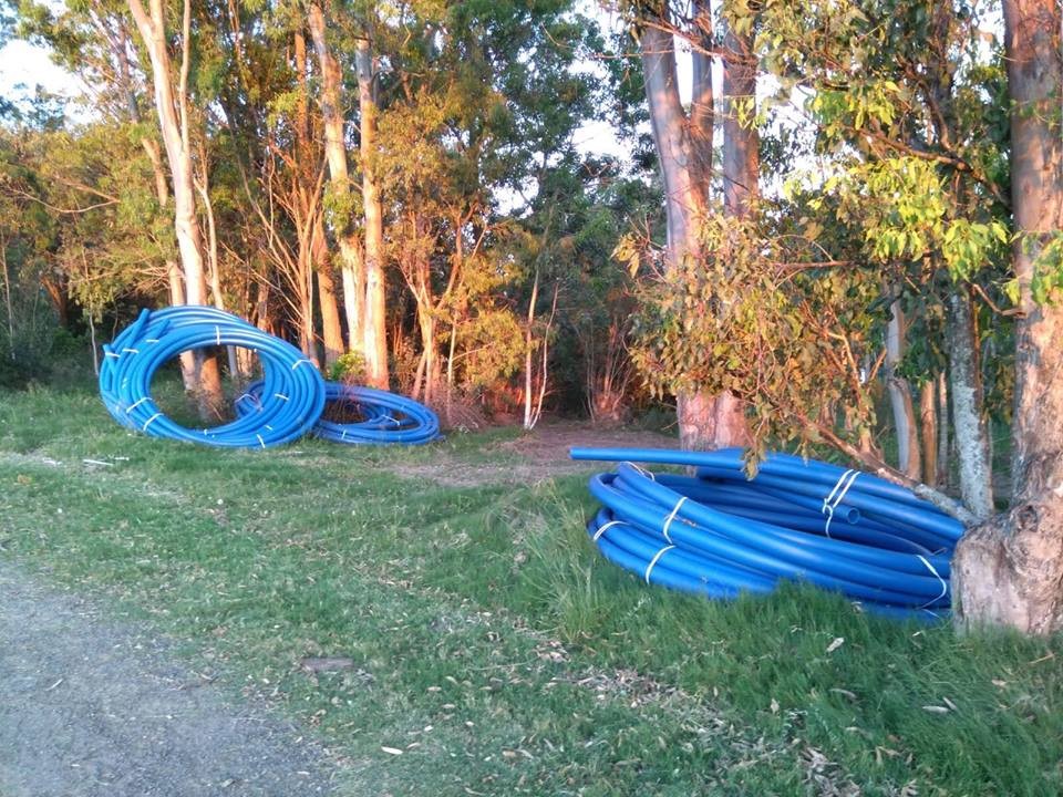 Los caños color azul oscuro que utiliza la empresa para llevar el agua corriente, fueron apilados a un costado de la ruta 10, en el km 229, justo en el límite entre La Pedrera y Punta Rubia.