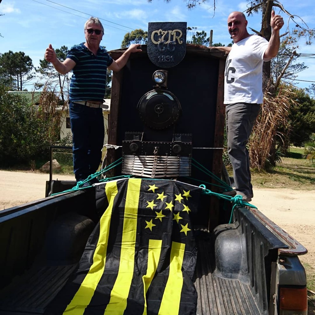 Ferrari, quien además es hincha del club, explicó el proceso de armado a La Paloma Hoy ”todo empezó con un calefón, que es la parte del tanque, traté de hacer lo más parecido posible a la locomotora emblema del club, siempre utilizando materiales que reciclados que encontré en el vertedero de La Paloma, y otros que ya tenía. Me llevó casi 50 días y 50 noches… fue un laburo muy grande… los durmientes los fabriqué con piques, después tiene el escudo, una maquina de humo adentro, y faro piloto de 12 volt con fuente incluida”.
