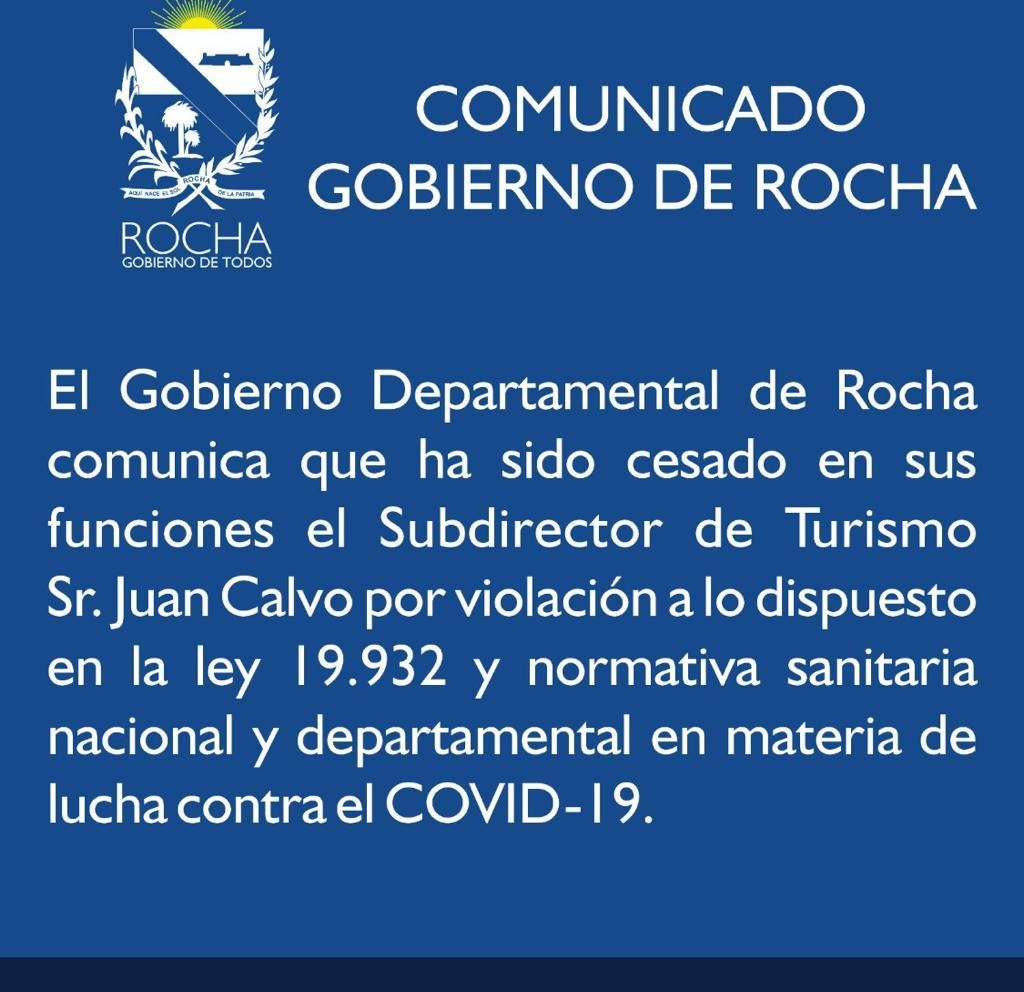 Gobierno de Rocha informó a través de un comunicado que esta tarde cesó en sus funciones al sub director de Turismo Juan Calvo “por violación a lo dispuesto en la Ley 19.932 y normativa sanitaria nacional y departamental en materia de lucha contra el COVID-19.