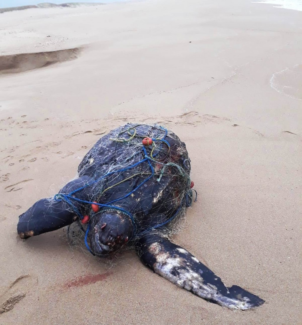Apareció una tortuga siete quillas muerta, envuelta en una red de pesca