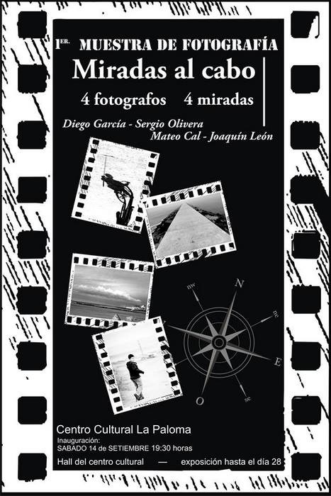 El próximo sábado a las 19:30 será la inauguración de la 1ª Muestra fotográfica "Miradas al Cabo". Diego García, Sergio Olivera, Mateo Cal y Joaquín León, expondrán sus trabajos en el Hall Central del Centro Cultural de La Paloma hasta el 28 de setiembre.