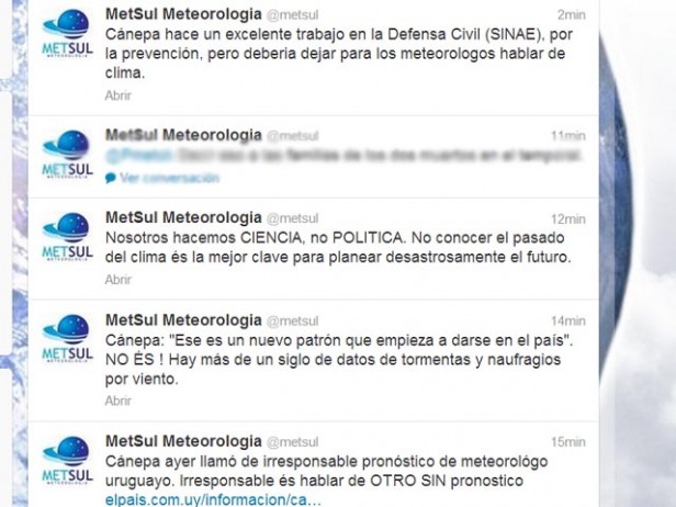 El primero dice “Cánepa ayer llamó de irresponsable pronóstico meteorológico uruguayo. Irresponsable es hablar de otro sin pronóstico”.