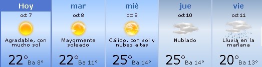 Martes: Soleado a parcialmente nublado con birsa a la tarde. Mínima de 11º y máxima de 22º.
