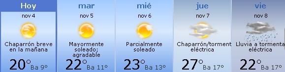 El martes estará agradable con sol y algunas nubes. Mínima de 11º y máxima de 22º. El miércoles sería el día más agradable de la semana, ya que estrá parcialmente soleado y agradable; con brisa a la tarde. Mínima de 13º y máxima de 23º. Si bien el jueves sube la máxima que rondará los 27º, tendremos incremento de nubosidad, con chaparrón o tormenta eléctrica en algunos lugares a la tarde; y por la noche se mantendrán las condiciones inestables con la posibilidad de alguna tormenta eléctrica. Mínima de 17º y máxima de 27º. EL viernes fuertes lluvias y tormenta eléctrica. Mínima de 17º y máxima de 22º.