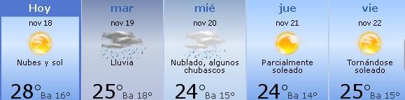 Jueves: se recuepra el buen tiempo con cielo parcialmente soleado y clima agradable. Aumento de nubosidad al anochecer seguido de nubosidad baja. Mínima de 14º y 24º de máxima.