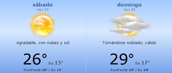 Para el domingo el cielo se tornará más nublado con clima cálido. Por la noche tendremos nubosidad considerable. Mínima de 17º y máxima de 29º.